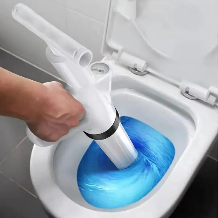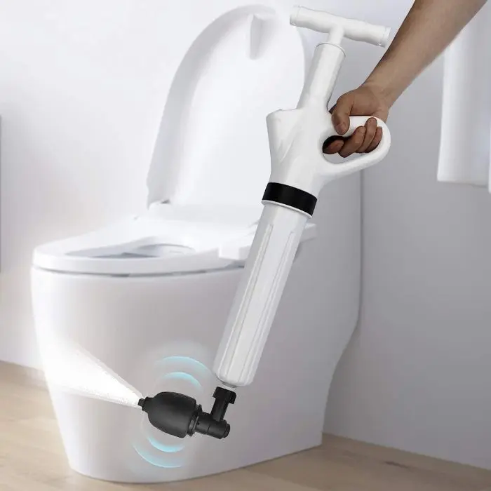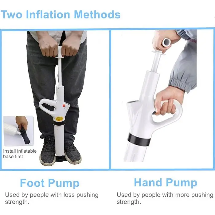 Consejo: simplemente conecte la bomba al dispositivo, bombee el aire en el dispositivo, incline en el inodoro en una posición vertical y presione el botón de aire para limpiar el inodoro o el fregadero.